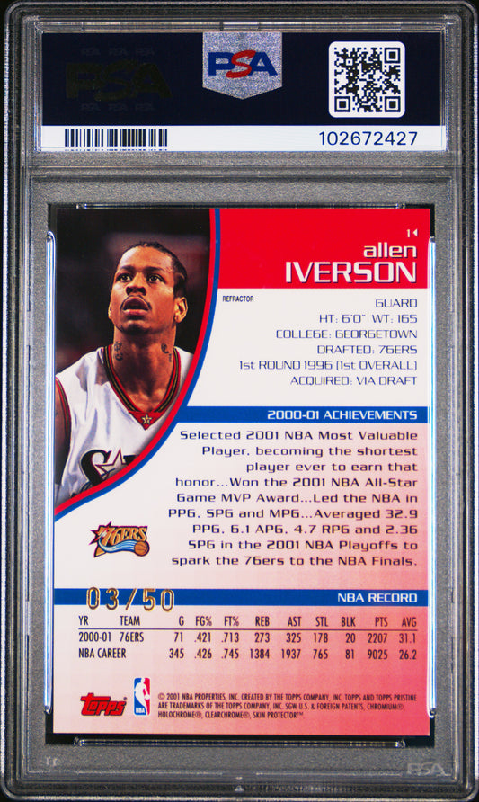2001 Topps Pristine Allen Iverson # 3/50 Jersey Number Refractor PSA 10