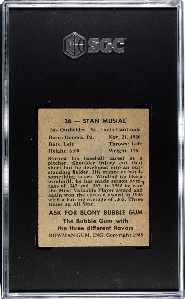 You are purchasing a 1948 Bowman Stan Musial #36 SGC 6. You will receive the exact item in the photographs. Thank you for looking. Listed With Mascot.