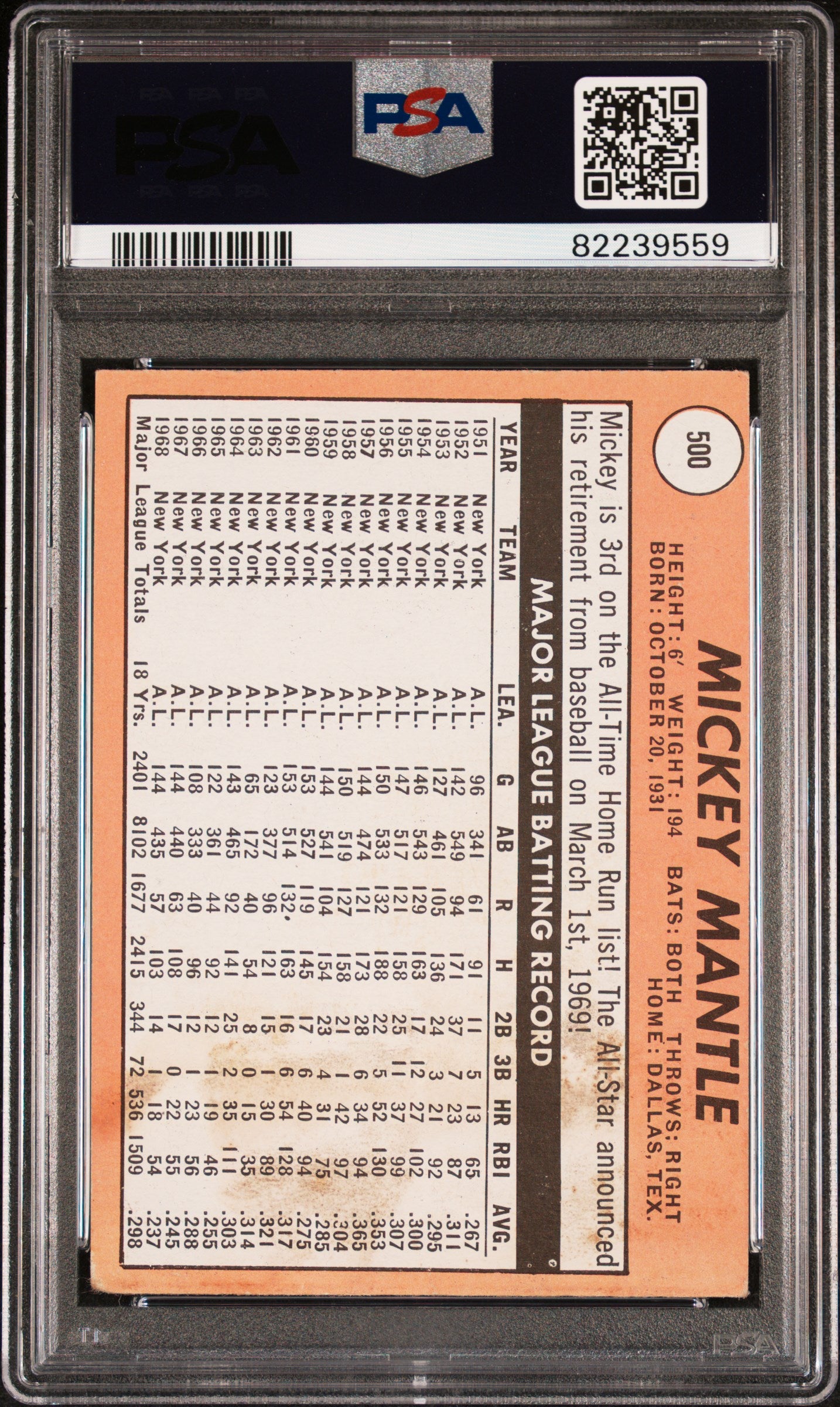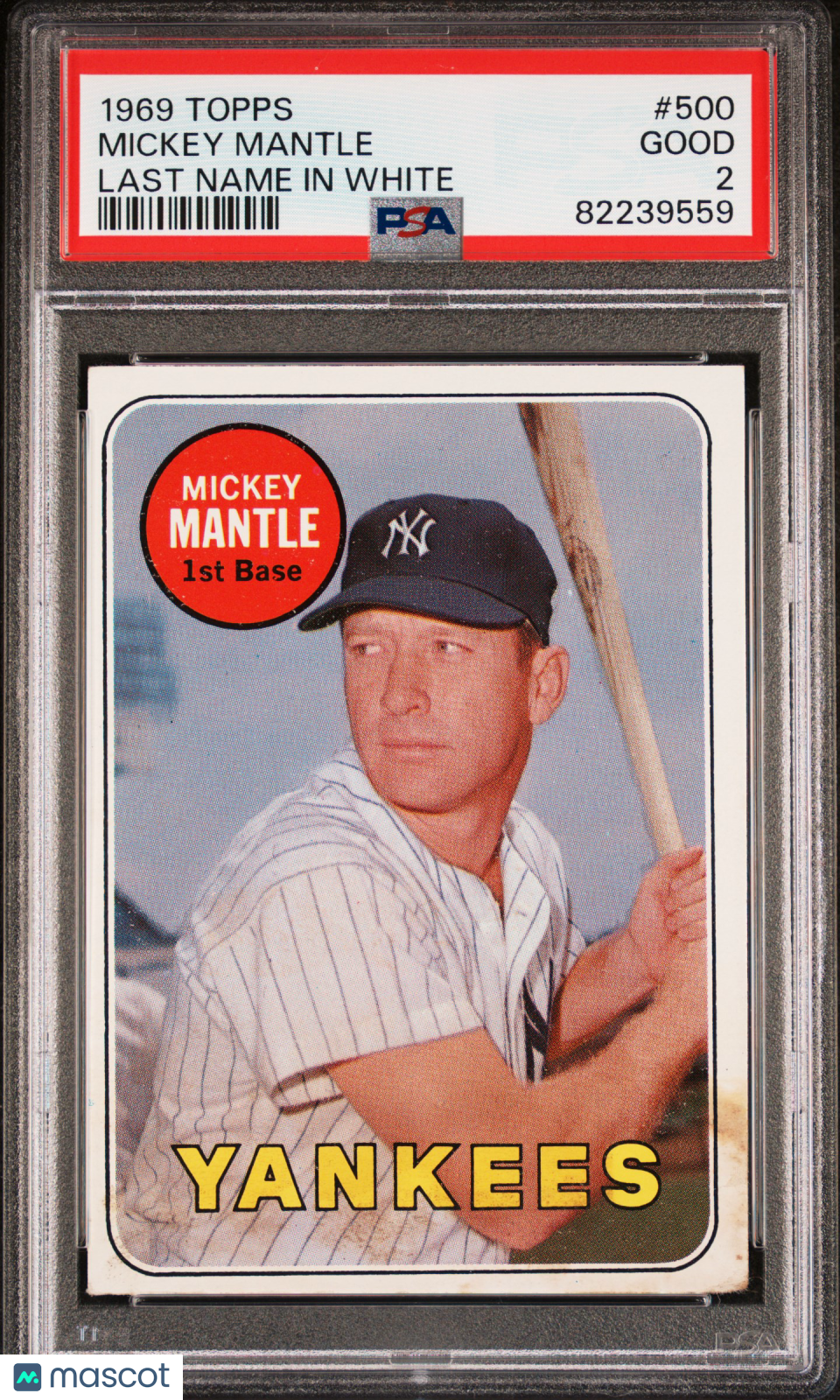 1969 Topps Mickey Mantle #500 Last Name In White PSA 2