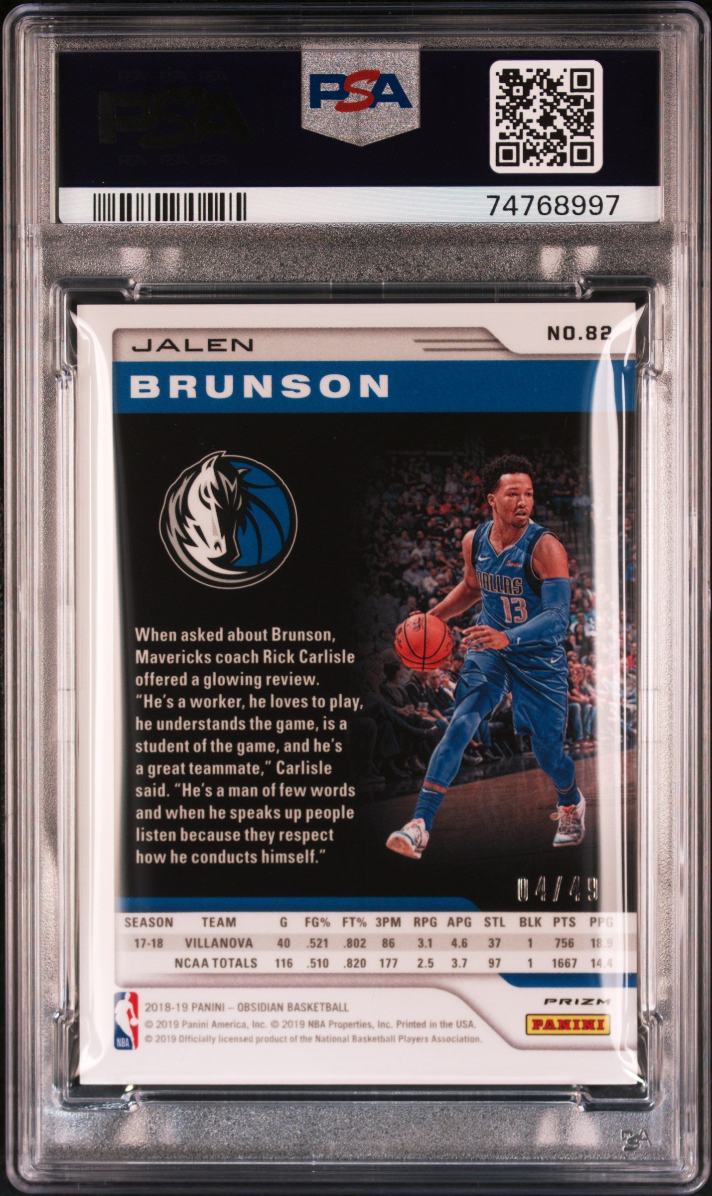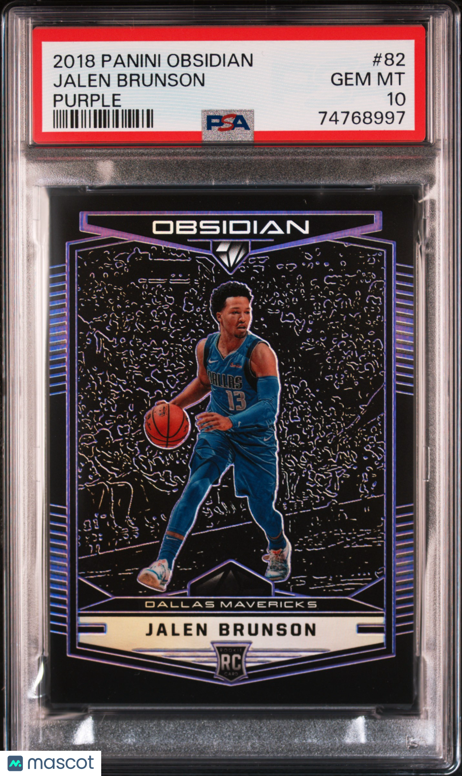 You are purchasing a 2018 Panini Obsidian Jalen Brunson #82 Purple PSA 10. You will receive the exact item in the photographs. Thank you for looking. Listed With Mascot.